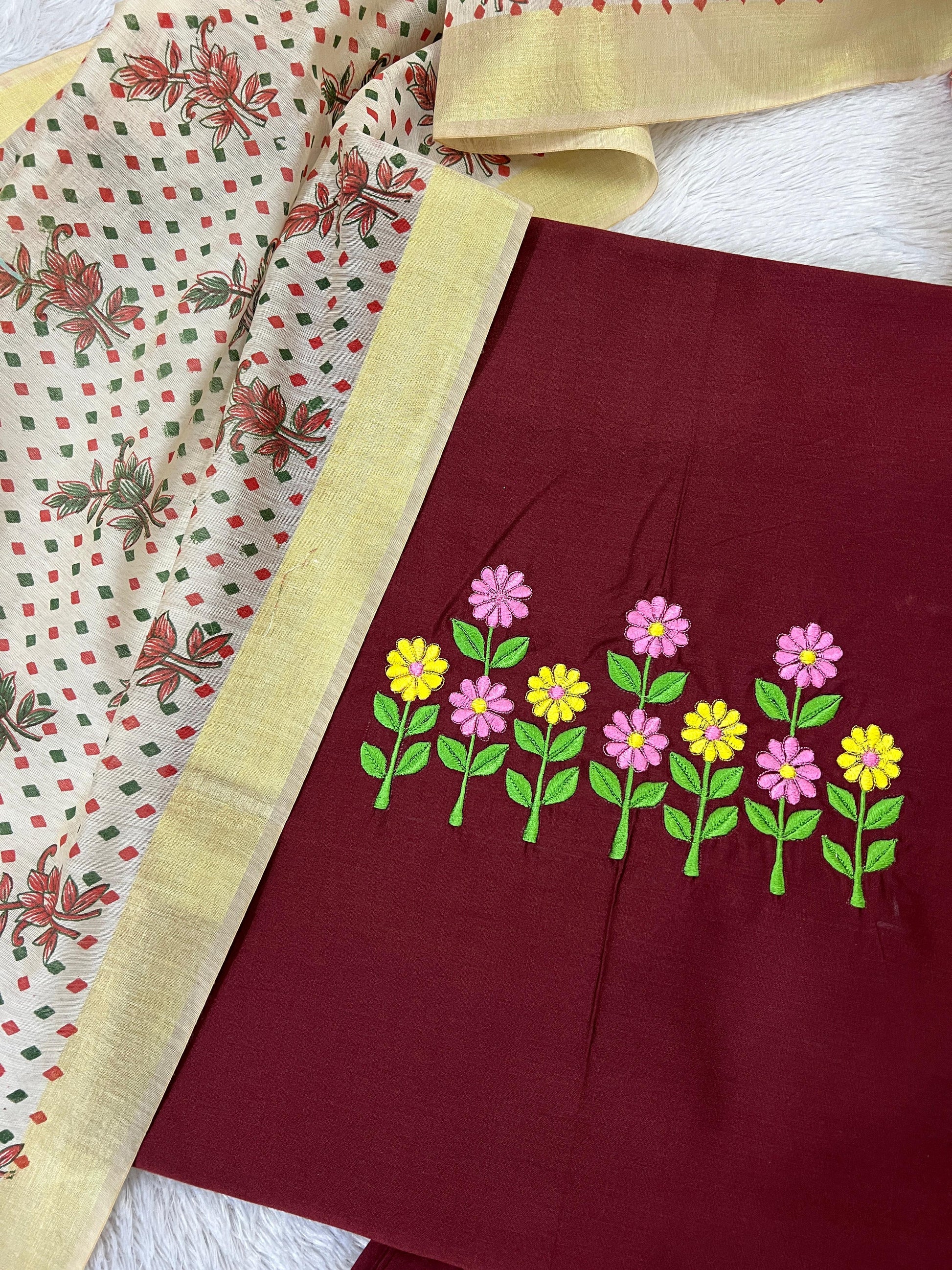 Add a touch of grace and freshness to your collection with this Maroon Floral Embroidered Cotton Suit Set, beautifully complemented by a cream printed dupatta. The maroon kurta material features charming floral embroidery in vibrant yellow, pink, and green, bringing a lively accent to the rich fabric.