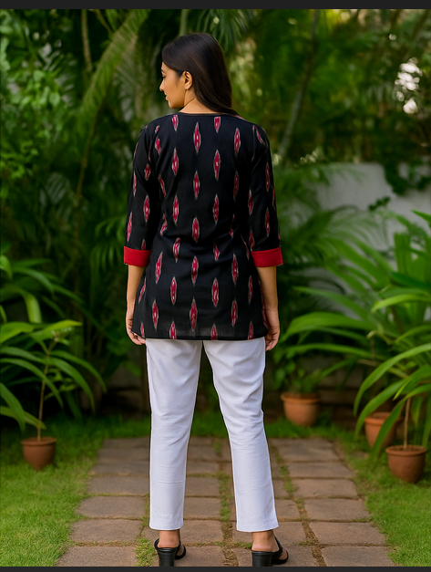 A comfortable Short Kurti/Tunic Top featuring a striking Black and Red Ikat Print. The geometric, diamond-like motifs are highlighted by bold, solid Red Contrast Trims at the V-Neckline and the 3/4 sleeve cuffs. The top features practical Side Slit Pockets and a relaxed, straight fit, making it perfect for pairing with white or neutral trousers for a vibrant and modern casual ensemble.